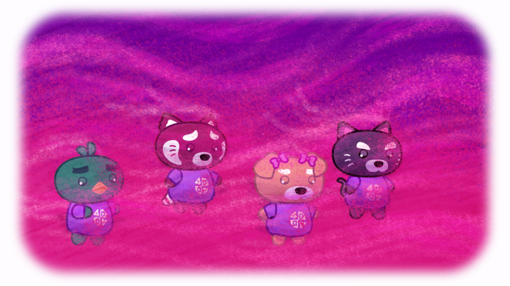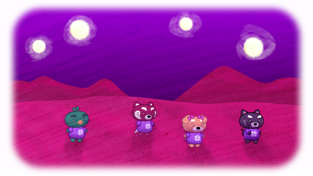 La noche cayó sin aviso y el cielo se volvió de un morado profundo, con esferas lejanas apenas iluminando las dunas. El frío reemplazó al calor del día y el grupo avanzó en silencio sobre la arena rosa, mientras el viento recorría el desierto con un murmullo constante que ya no parecía natural.