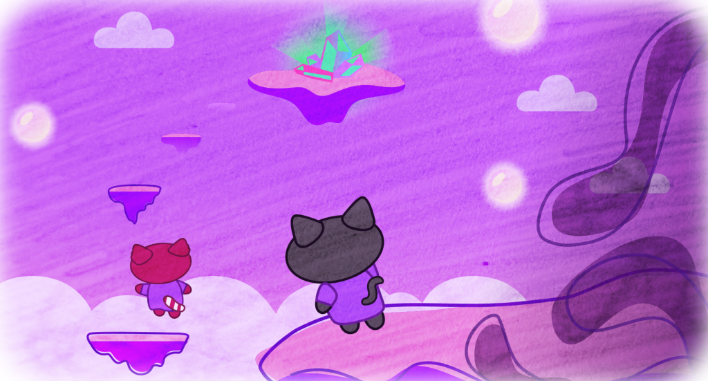 El suelo bajo su cuerpo era extraño, suave como arena pero con una resistencia elástica que la impulsaba ligeramente al moverse. Al incorporarse, sintió una ráfaga de viento húmedo acariciarle el rostro. Frente a ella se extendía una isla flotante que crujía levemente con cada movimiento. A su alrededor, un vacío morado se perdía entre un mar de nubes. Más allá, como suspendidas en el aire, se veían otras islas conectadas por fragmentos de caminos rotos que flotaban como restos dispersos de un tiempo olvidado. Sobre su cabeza, varias esferas flotantes de luz titilaban, brillando de forma intermitente, como si observaran en silencio cada movimiento.