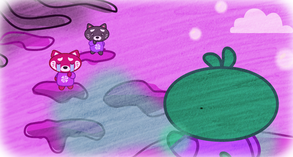 Se miraron en silencio. La panda intentó sonreír, aliviada de no estar sola. El gato, en cambio, se mantenía alerta, sus ojos brillando con atención.
