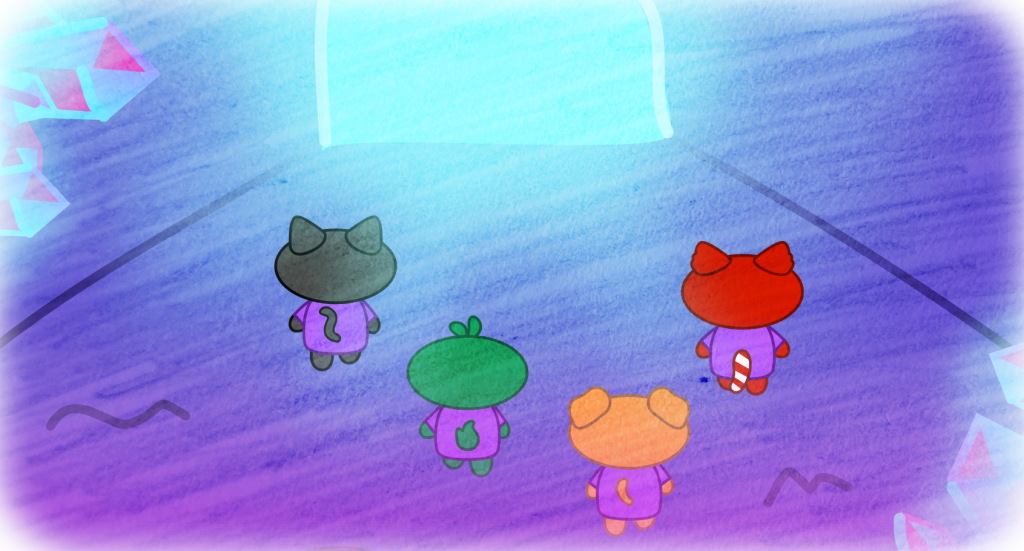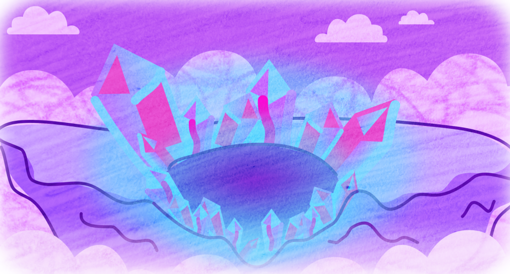 Tras caminar durante mucho tiempo entre la neblina espesa, la visibilidad comenzó a mejorar poco a poco. Frente a ellos apareció una isla mucho más grande que las anteriores. En su borde se alzaba la entrada a una cueva subterránea, rodeada por enormes cristales que brillaban con tonalidades azules, rosas y moradas, iluminando la bruma con reflejos suaves y ondulantes. Sweet se acercó con cautela, observando los destellos.